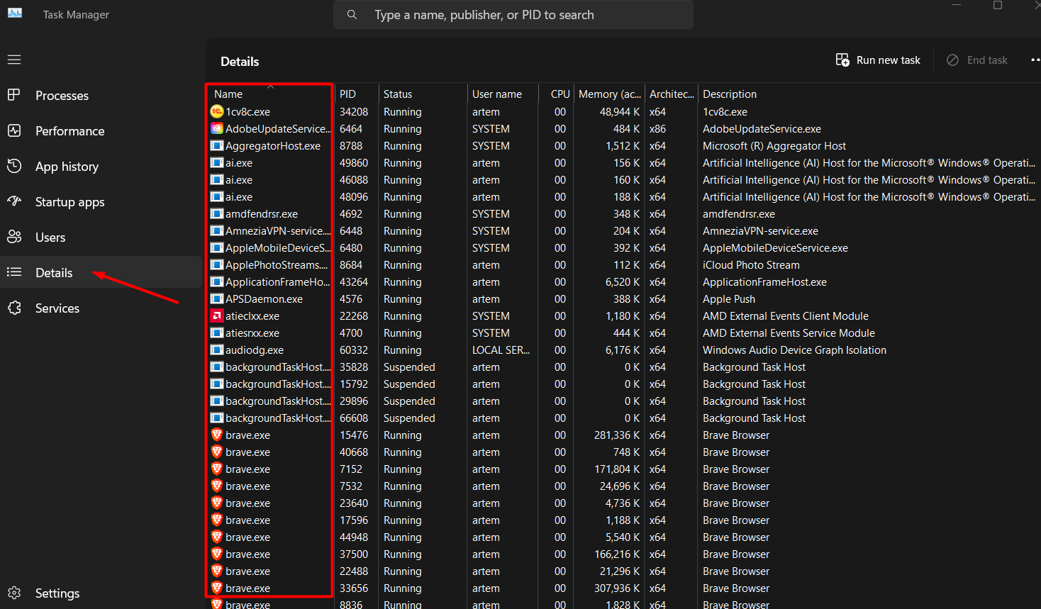 Чтобы выяснить как называется процесс вашего приложения, заходите в диспетчер задач